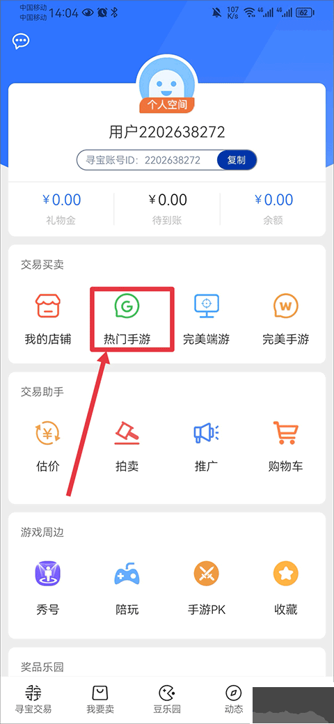 6、在热门手游界面中找到个人中心,并点击已寄售