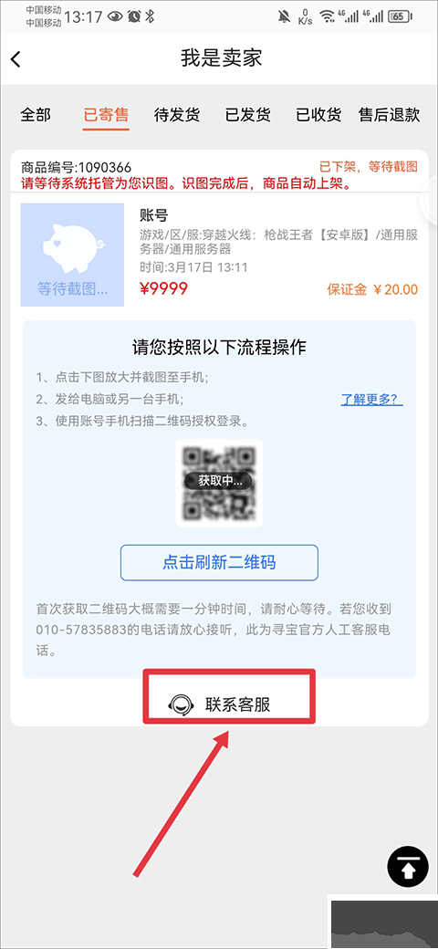 1、按照卖号指南的第五点步骤开始,在已寄售页面中找到需要取消的订单,并点击联系客服