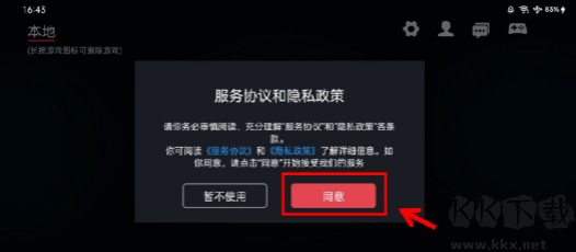 1、将移动设备连接GameSir-X2手柄,启动蛋蛋模拟器应用,会出现服务协议和隐私政策提示,选择"同意"。
