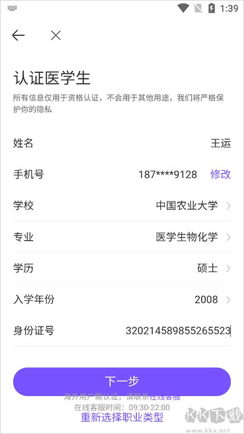 4、例如选择医学生认证后就可以在新打开的页面中输入姓名、学校、专业等信息后点击下一步