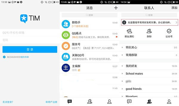 3、TIM在完全同歩QQ好友及信息的情形下可以做出开始提及的改善感觉还是值得一试的。自然服务平台也要有充足的用户量,即便社交app做得再好,只有单方地选择而无法联接人的话外流不可避。