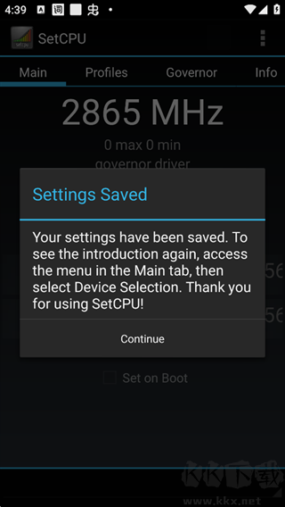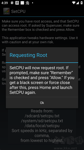 上面就是SetCPUapp的介绍了,本站下载资源均来源网络,不存储任何下载资源,如有侵犯您的权益或者资源有问题,请及时联系我们,更多setcpu相关资讯及软件,请关注收藏西西软件站。1、请确保已经获得ROOT权限,当出现授权请求时,请选择"记住选择",并点击"允许"或"始终允许"。