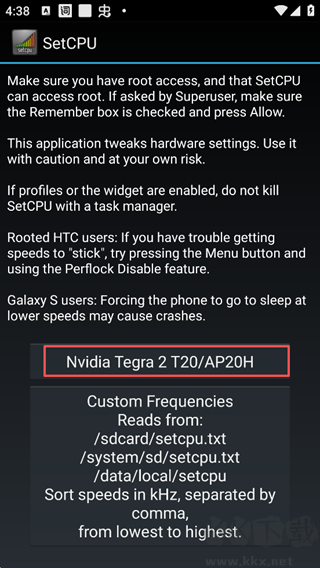 1、打开SetCPU App,出现如图界面,可直接点击推荐的Nvidia Teqra 2 T20/AP20H选项