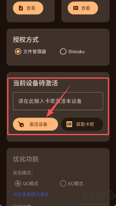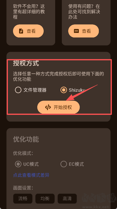 2、选择授权方式:文件管理器或Shizuku,点击开始;