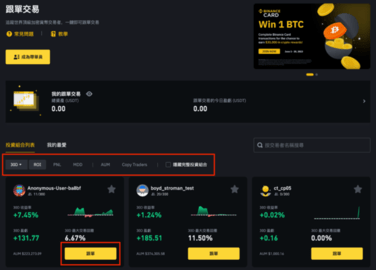 2. 选择跟单投资组合。您可以通过收益率、盈亏、最大回撤等指标进行筛选。点击跟单。