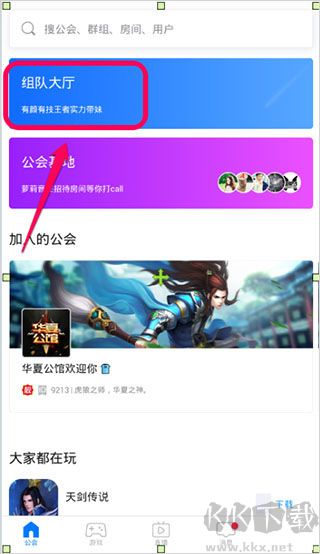 1、完成注册登录后,在主页面找到"组队大厅"入口,点击进入。