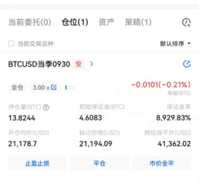 04 挂单成交后,可在持仓界面中可查看订单的相关数据,例如保证金、收益、收益率、预估强平价等。