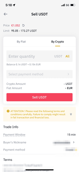 接着,底部会显示买家的付款方式、付款时间限制和其他要求。你可以在通过数字货那里填写要卖的币数量,或者在通过法币填写你想收到的人民币金额,填好后点击卖出确认订单。