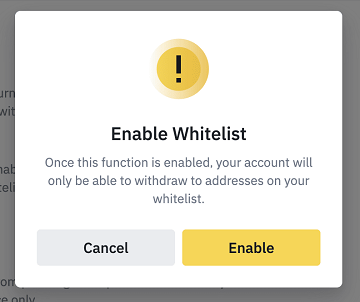 3.请注意,开启提现白名单功能后,仅支持提现至白名单上的地址。点击开启继续操作。