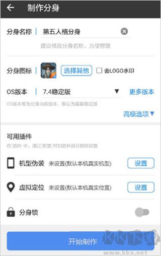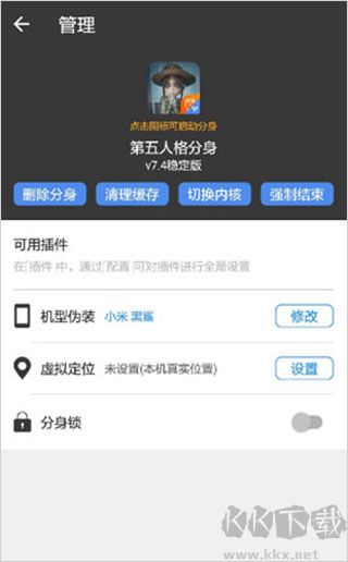 3、接着输入分身名称、分身图标,选择OS版本,目前可用插件有限,包括机型伪装、虚拟定位、分身锁;建立好分身后,点击管理,可进行的操作有删除分身、清理缓存、切换内核、强制结束。