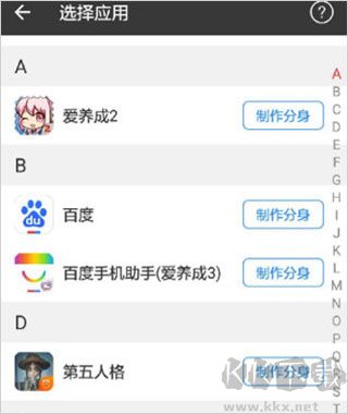 2、点开加号以后会显示你自己手机里的软件,点击字母选择软件制作相应分身;