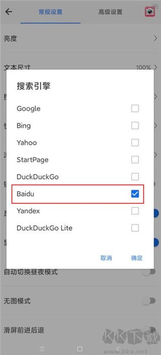3、找到搜索引擎一栏,将google改为baidu,默认搜索引擎就从谷歌变成了百度,就可以在国内使用了