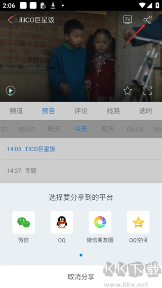 2、点击播放页面,左上角的分享按钮可以选择分享到哪些平台。