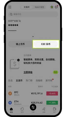 打开欧e首页,点击“C2C买币”。
