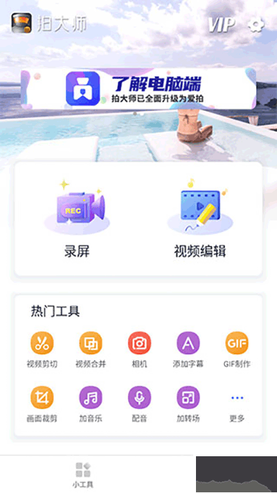 1、打开app进入页面,然后可以看到首页有两个选项,分别是录屏和视频剪辑,在主界面点击热门工具中的"视频剪辑"功能