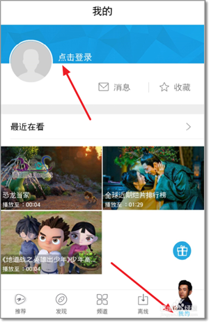 点击右下角我的进入个人信息界面,可以到有消息与收藏,这需要注册登录中国蓝TV之后才能使用。
