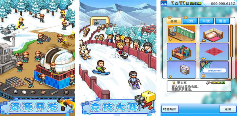 滑雪是很多人在冬天都会去参与的一项活动,闪耀滑雪场物语虽然使用的是一个像素场景,在每个玩家都能感受到真实的滑雪趣味,游戏开启之后,可以在冰天雪地的场景里,修建一个自己心仪的滑雪场,在这个滑雪场里需要设置不同的滑雪道路,同时还需要建造一些其他的周边设施,设施完善之后,才能有更多的人来滑雪,除了经营之外,还可以和其他的成员进行滑雪竞技。