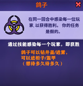 鸽子:主要是以感染作为武器,可以慢吞吞的接近玩家,然后将玩家感染,主要的目标就是让所有的人都感染。