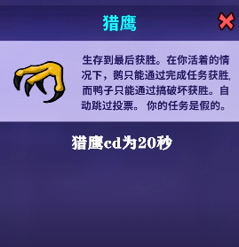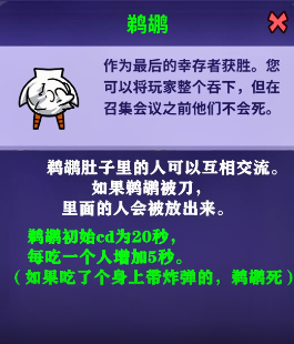 鹈鹕:拥有一种比较强的吞噬能力,被吞玩家在会议之前是不会死亡的。