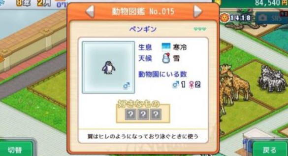 动物园经营物语是日式风格的经营游戏,细节做得很到位,刚开始只有一个小园区,几只小动物要认真照顾它们,按时喂食、清洁笼舍,动物们健康快乐,慢慢赚了钱就能扩建园区,引进更多动物,动物繁殖很有意思,要找年龄合适、健康的动物配对,配对成功后会生下幼崽,幼崽会继承父母的优点。