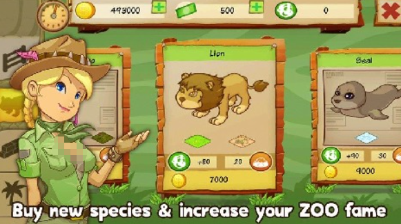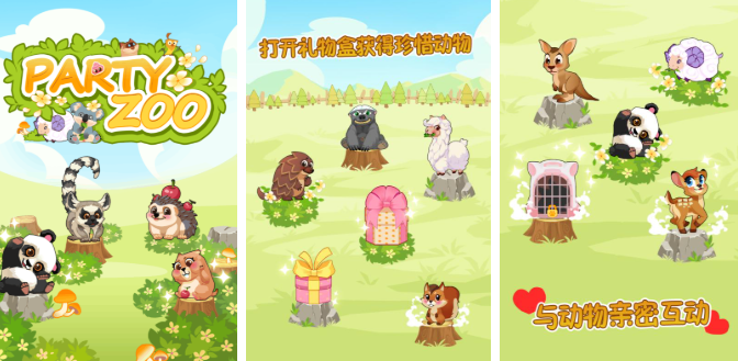 欢乐动物园的画面特别可爱,刚开始只有几只小动物,接待游客能赚金币,慢慢扩建园区,引进狮子、老虎,再后来能引进熊猫、金丝猴,看着园区里的动物越来越多,管理园区很简单,点击一下就能清洁笼舍不用自己动手,自动喂食系统会定时给动物喂食物,不用担心动物饿肚子。