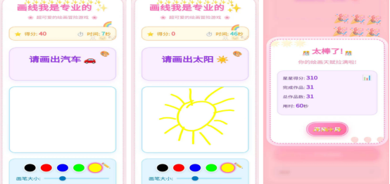 画画是极具创意的项目,用简单的线条按照要求将相应的物品画出来。没有任何的限制,随心所欲发挥出自己的创意,比如有的关卡需要画出太阳,用不同颜色的画笔,画出冉冉升起的太阳,有的却需要画出炫酷的汽车,可将外在的轮廓画出来,也可画的细致入微。