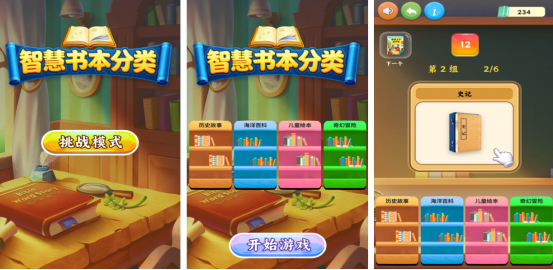 在闯关时还能学到更多知识,也覆盖所有的书籍类型,比如历史文学等等。操作方式很简单,指尖滑动屏幕即可将书籍正确分类。在开始后屏幕中间会出现不同的书籍,比如有儿童绘本或者是历史故事等等,下方会呈现4个不同的分类,只要将书籍分到正确的类别中,即可完成闯关,获得高分。