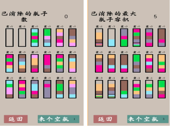 模拟了现实生活中深受大家喜欢的玩法,在里面的瓶子里会有各种各样的色彩,通过将相同的颜色进行分类,使每个瓶子都能完成消除,成为空瓶子的情况下,就可以完成任务。还有成长以及无尽两种模式,大家都可以尽情的发展自己的能力。无论是在休闲或者是各种场景的时候,大家都可以在这款游戏当中锻炼一下思维。