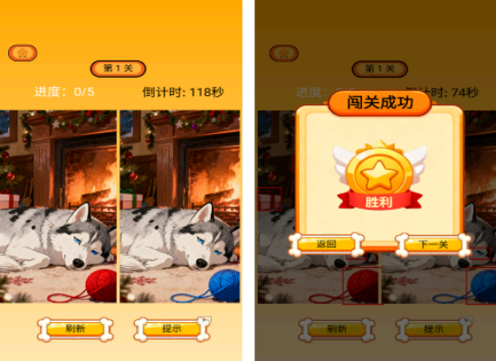 卡通的风格其实属于以找不同玩法为主,在丰富的关卡当中,需要在倒计时结束之前,观察两张图片当中所具备的区别,无论是颜色上的还是在一些细节之处的,都需要仔细的进行观察,比较适合8岁以上的人体验,并没有年龄方面的限制,在每次闯关成功以后,也能获得相应的奖励,帮助完成拯救小狗这样的任务。