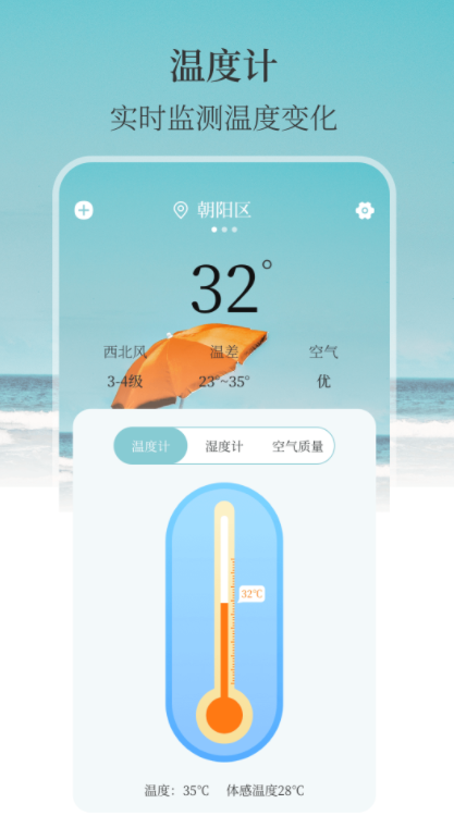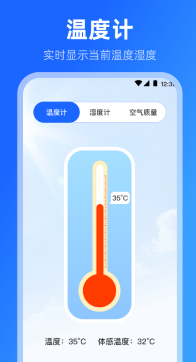 这款应用操作极为便捷,启动后即可快速显示当前温度数值。它支持室内外环境检测,界面清晰直观,同时呈现空气湿度与空气质量状况,便于用户全面掌握周围环境。无论是在出门前查看天气情况,还是在家中监测居住舒适度,它都能提供可靠支持,是日常生活中值得信赖的小助手。