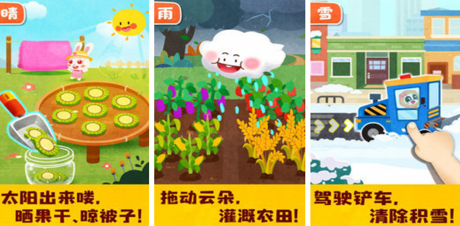 这款早教手游,可以让婴幼儿时期的孩子,认识最基础的风雨雷电以及雨雪等天气情况。玩家可以在游戏中和天气进行互动,赶走阴云密布露出晴空万里的太阳,或者收集大量的小水滴给小蘑菇浇水,长成大蘑菇。充满童趣童真的游戏方式,极其贴近生活的教育方式,都让这款手游成为孩子最佳的天气变化认知游戏。