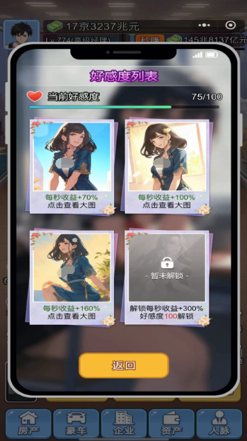 以“重生逆袭”为核心主题的游戏作品,让玩家从底层出发,在商海沉浮中实现命运翻盘。剧情融合了典型的爽文设定:主角因机遇重返过去,凭借先知优势积累财富,夺回家族控制权。过程中会遭遇势利眼角色的嘲讽或意外收获爱情。游戏中设置了上百个关键抉择点,每一个选择都将影响人际关系、资产状况与最终结局,考验玩家的战略思维与判断力。