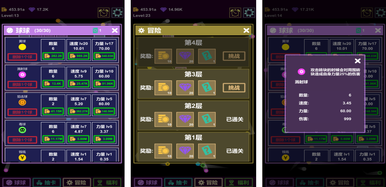 在这个物理弹球的游戏中,获取小球是玩家们进行游戏的基础,而各种小球的解锁就需要玩家们进行养成了,为了获取更多的小球,玩家们需要尽可能的对它进行升级,各种卡牌也可以增加小球的击打效率,小球整体有九种,而一共有15种不同的卡牌,辅助小球更加高效率的击打就是卡牌存在的意义。