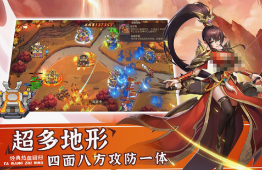 属于塔王之王的续作,也是经典塔防游戏当中热度比较高,以正统的三国故事为主要背景的,玩家将成为里面的主角,在与敌人交战的时候不断的招募名将,来完成保卫国家的重任。除了面对敌人的攻势时,玩家可使用相应的法术技能,展开强烈的伤害力,还要组建最强的防御阵容,才有机会取得更好的成绩。