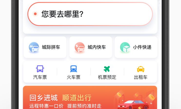想要去哪里在这里输入目的地就可以了,软件提供了城际的拼车以及城内的快车等多种服务,还有汽车票和火车票的购买,让大家的出行变得更加方便与简单。