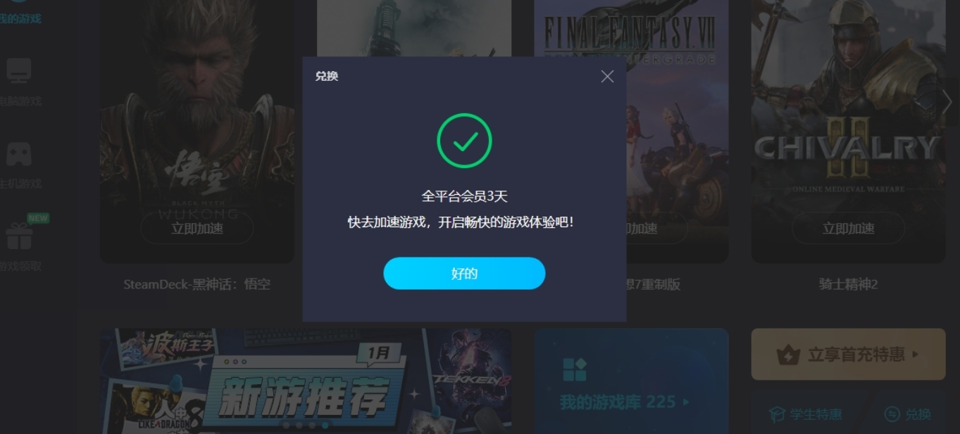 当然了,大家也能在里面去通过对应的福利来享受免费加速,比如新用户首次登陆就能给到24h的加速时长,此外部分游戏也是开放了限时免费的加速服务,让用户能轻松获得良好的加速体验,针对一些打算长时间使用的朋友,各位也可通过首页去兑换3天的加速时长,其具体的操作方式也很简单,各位点击输入【biubiu不卡顿】,就能额外获得了,如此一来也能让玩家享受超长的免费加速时间。