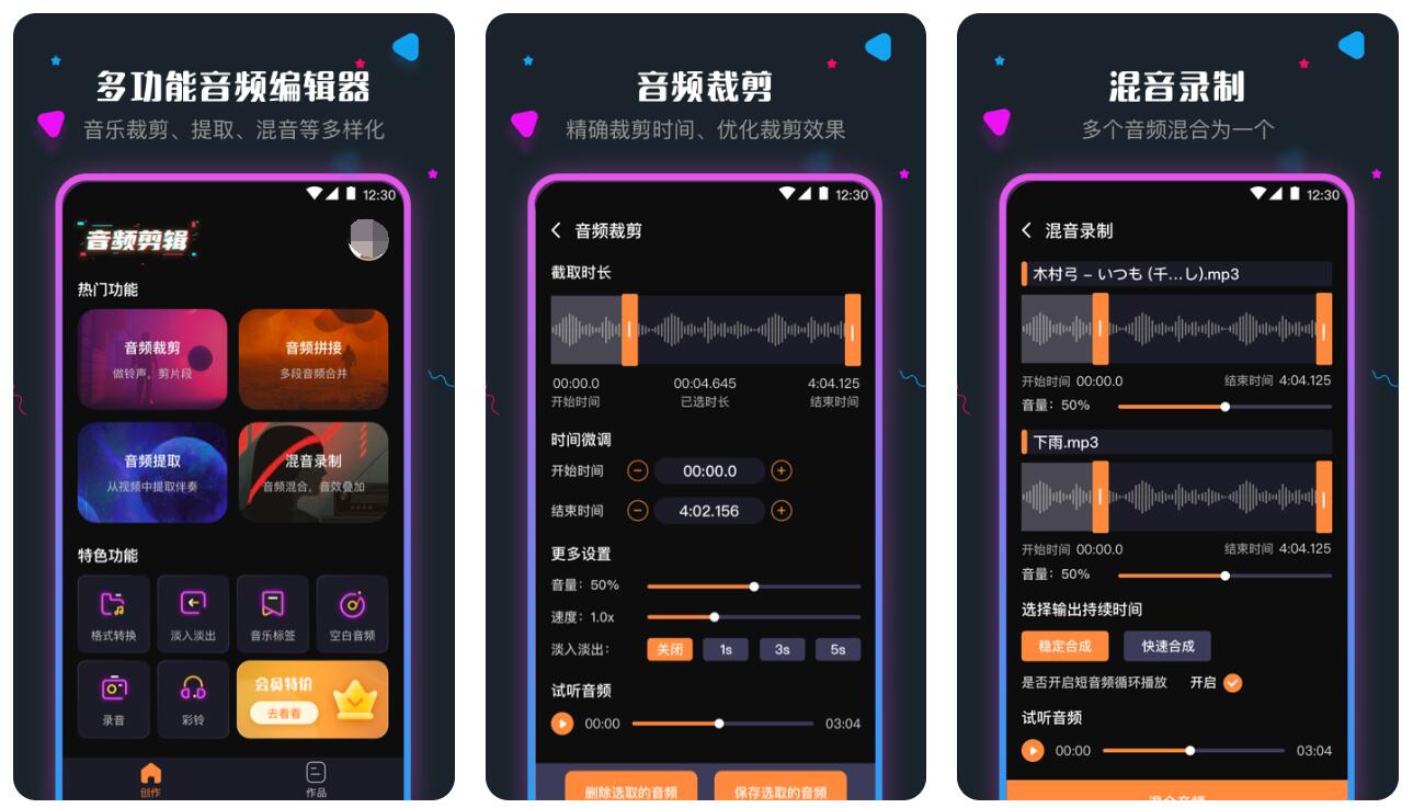 作为一款可以随意改变音配格式的app,用户在其中可以选择大量常见或者冷门的音频未文件。同时各位也可以利用剪辑工具,来创造出属于自己的音乐。拼接的方式还可以有效提升音乐的趣味性,大家也可以加入各种婚姻特效来提升质感,从而让每一段音频都拥有独特的旋律,没灵感进行剪辑的时候,还可以在app当中去观摩别人的作品。