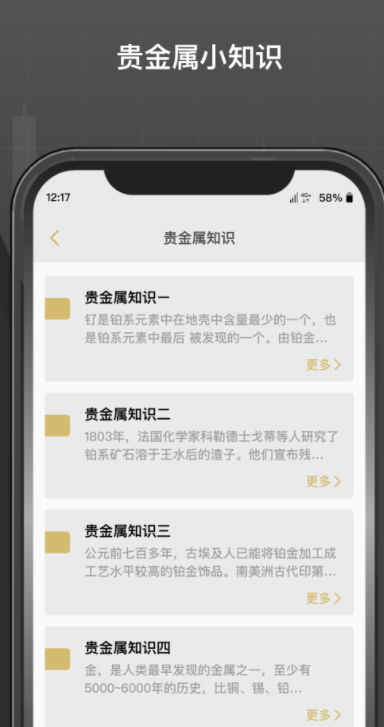 这款软件提供大多数贵金属的供应与需求信息,帮你发现投资的机会。有特色的贵金属研究院,发布金属供应求购等参考数据,用户也可以从中了解更多金属小知识。