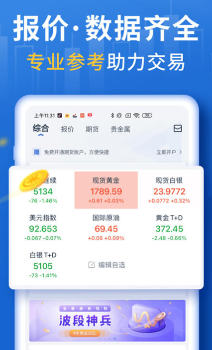 一分钟开户千元投资大宗商品,提供上百款黄金、白银、外汇等期货的实时买卖行情,有专业的报价与黄金交易数据实时更新,方便用户进行贵金属期货的交易。