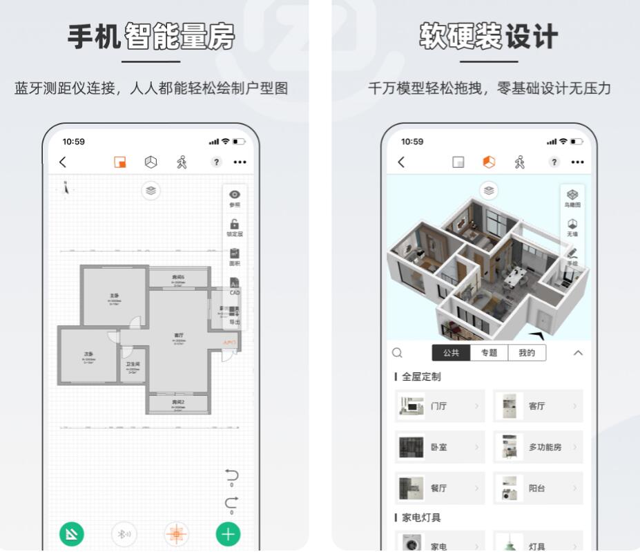用户使用蓝牙连接上专业的仪器,就可以去进行测量,把自己家的房型导入到APP当中,每个房间的大小一目了然,方便你去进行设计和布置。平台将上万个不同类型的模型,都如实地添加了进去,用户在应用内,自由地进行拖拽,就能大致勾勒出一个粗略的设计图,无论是硬装还是软装,都能在APP内实现,并且,还能预览最终的效果图。