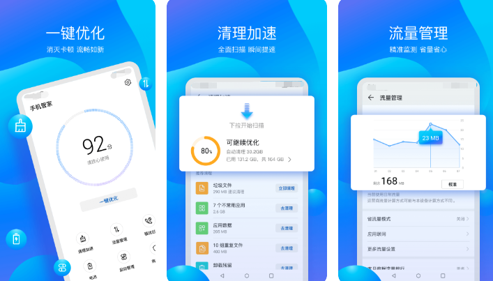 针对用户的手机进行多功能管理,从文件清理,到空间释放,所有的功能都十分实用,同时还有专属的流量数据观看,采用图表的形式,简洁明了。