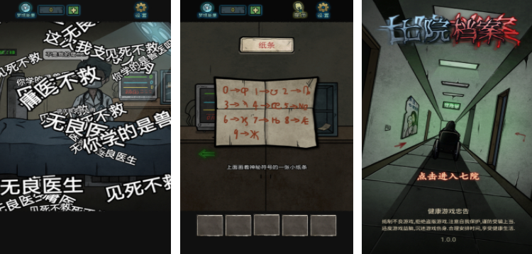 七院档案是非常考验玩家胆量的一个解密游戏,进入到这个游戏之后,玩家会来到一个非常诡异的医院,在这个医院里经常会传出一些奇怪的声音,为了探索这个医院的真相,玩家将会伪装成病人,在这个过程中,可以悄悄去探索每一个场景,并且根据在游戏里获取的各种线索,不断去探寻医院背后的真相,玩家还需要想办法让自己逃离这里,这样才能把这个医院的真相公之于众。