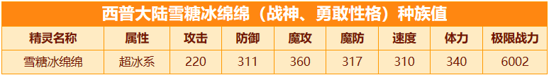 冰系精灵中拥有一个很强的精灵,而且也很适合新手玩,就是雪糖冰绵绵这个精灵,他拥有冰系技能,也拥有超高的体力和魔法防御魔法攻击,也可以在一定的战斗范围内提升速度,提高体力,在冰系精灵中拥有战神称号。