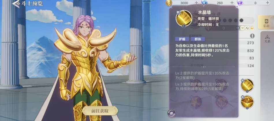 水晶墙作为循环技,能够为自身以及生命值比例最低的1名友军生成水晶墙,吸收穆120%攻击力的伤害,持续时间5秒,这一技能的使用时机至关重要,合理运用可以在关键时刻保护队友免受致命伤害,在升级到Lv.2时提供的护盾提升至135%攻击力,在升级到Lv.3时提供的护盾提升至150%攻击力,而且持续时间增加2秒。