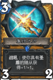 在对阵快攻卡组时,这套卡主要稳住四费前的节奏,在四费后,直接战斗号角一波铺场,再利用圣盾的高频率,基本就能拿下对手。
