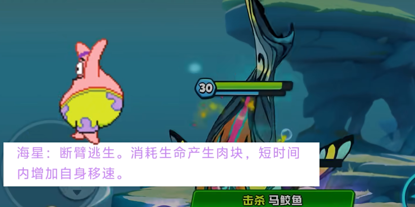 再就是第七海洋中的海星也值得各位去注意,其定位明显是偏向于苟分型的鱼类,技能是“断臂逃生”,效果是通过消耗生命产生肉块,并在短时间内增加自身的移速,这可以在关键时刻用于保命,因为对方对你发动啃咬的瞬间,如果你用这招生成肉块,那么对手就会转而咬到肉块上去了。