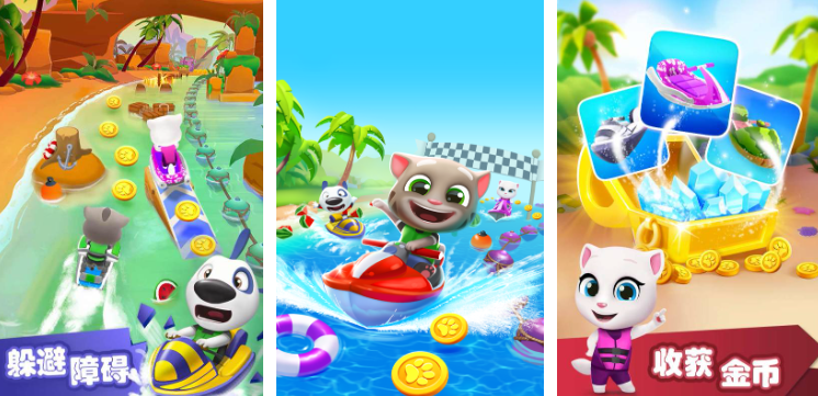 汤姆猫的摩托艇以水上竞速为核心,玩家操控汤姆猫等系列角色驾驶摩托艇,在波光粼粼的水面赛道中展开速度与技巧的比拼,体验水上飞驰的乐趣,赛道设计结合水上场景的特点,每个赛道都有独特的地形与障碍,湖泊赛道水面平稳适合新手熟悉操作,玩家需灵活调整方向与速度躲避危险。