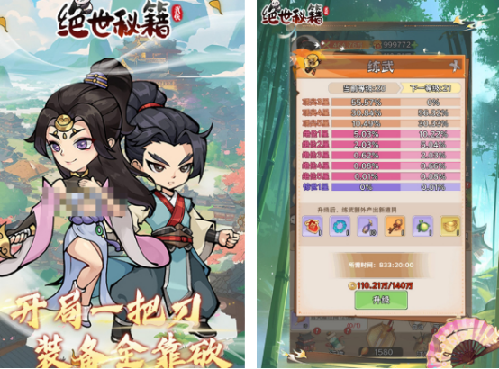 整体有着浓郁的国风,同样也是以武侠风格为主,玩家成为的是初入江湖中的人,所以一开始自己的实力并不是特别的强,不过却因为历练以及冒险当中,不断的历练自己打败敌人,渐渐地成为武林高手。以卡通的风格所打造,也能使用轻松挂机的方式,对角色进行养成,不断的在练武的途中学习绝世秘籍,合理的操作让你在武侠之旅当中施展魅力。