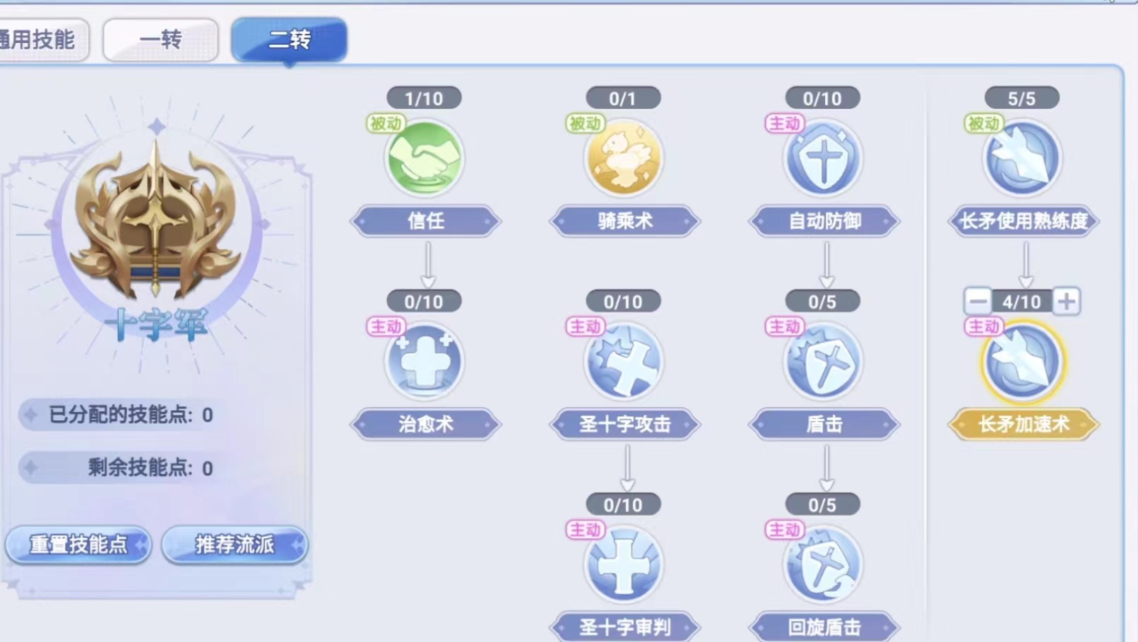 进入到一定阶段之后便可以二转,将最左边的信任加满治愈术不变,再将第三排从自动防御到回旋盾击竖着下来的一列加满。中间一排的技能可以不做改动。最后再将最右边的长矛使用熟练度、加速术和舍命攻击都拉满。