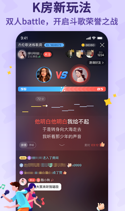 1对1演唱pk,推出全新的斗歌排位模式,唱歌冲段位连麦交友,还有随心点唱海量伴奏一键修音,让你想唱就唱,有爱豆专属聊天室,多人语音共同群聊,结识到心动声音。